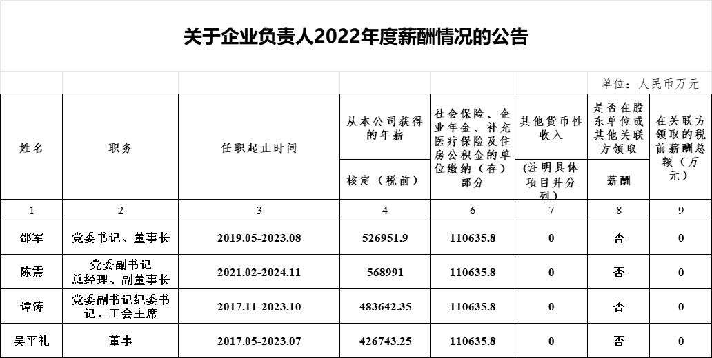 关于企业负责人2022年度薪酬情况的公告